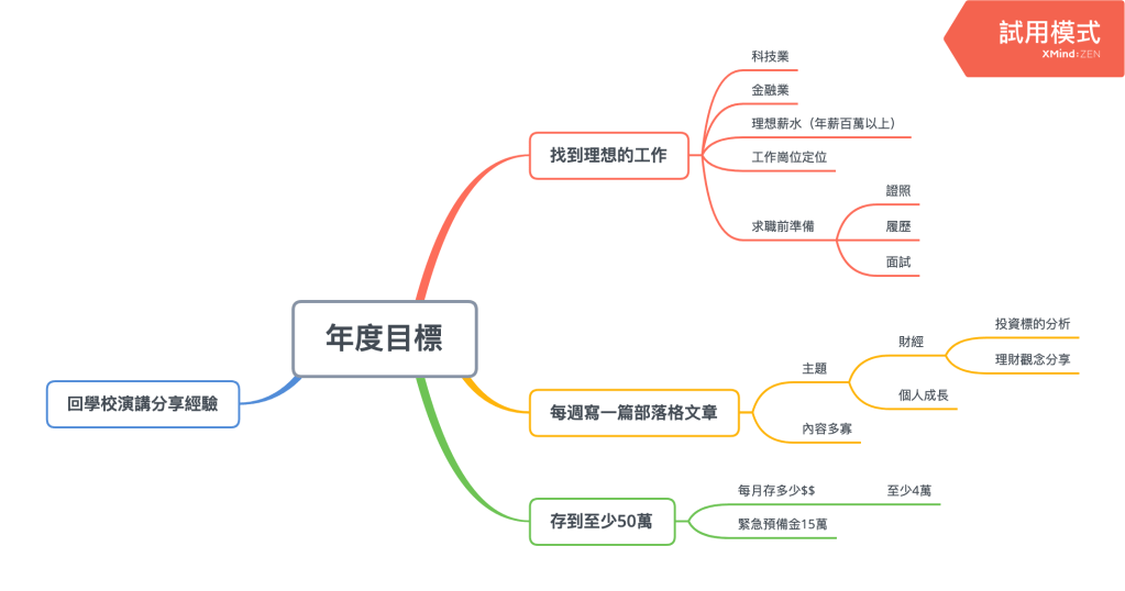 圖為我利用 Xmind 所繪製之年度目標心智圖