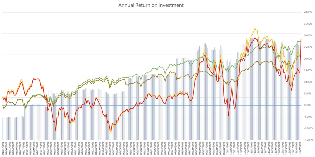 Q4有一波下跌段,在這之前的高檔我已經有做一定程度的去槓桿+提高現金水位,不過偏好左側交易的我在下跌段接刀還是會讓績效在下跌段差了些。而這時候我比較專注於財報空窗期行情,所以大部分的精力會放在台股的操作,也是在這段期間個人在台股的資金(本金)挹注比較多,最後報酬率的陡升也是因為台股在年末最後幾天大幅拉升有關,讓本年度的總投報率可以以些微之差勝過大盤。